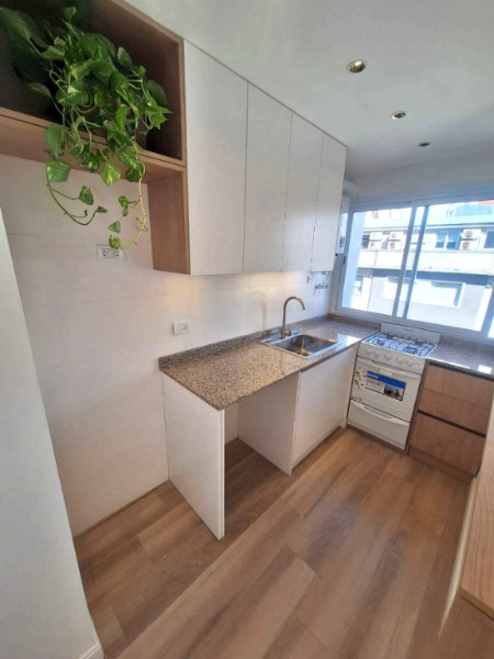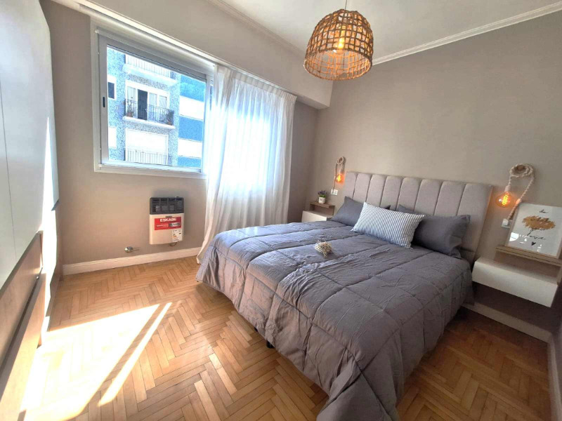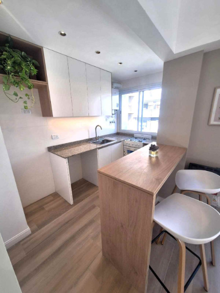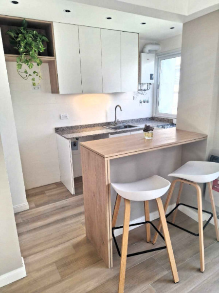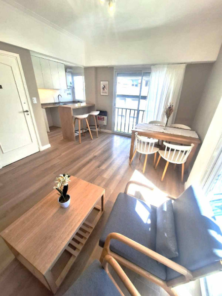 DOS AMBIENTES TODO EXTERNO RECICLADO A NUEVO. Amplio living comedor con dos balcones, uno francés y el otro saliente en vereda de sol. Dormitorio con placard a medida, ventana a la calle. Cocina con ventana externa integrada la living con barra. Conexión para lavarropas. Baño completo reciclado con ducha. Calefacción por tiro balanceado. Aberturas en DVH. Puertas premium nuevas con diseño. Muebles a estrenar. Decorado. EXCELENTE ESTADO.