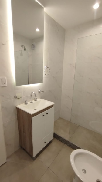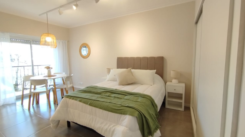 UN AMBIENTE RECICLADO CON BALCÓN A LA CALLE. Amplio ambiente externo, con balcón saliente a la calle en vereda de sol. Cocina integrada, reciclada con ventana a la calle. Baño completo reciclado con ducha. Placard empotrado. Pisos cerámicos. Muebles a estrenar. Decorado. EXCELENTE ESTADO.